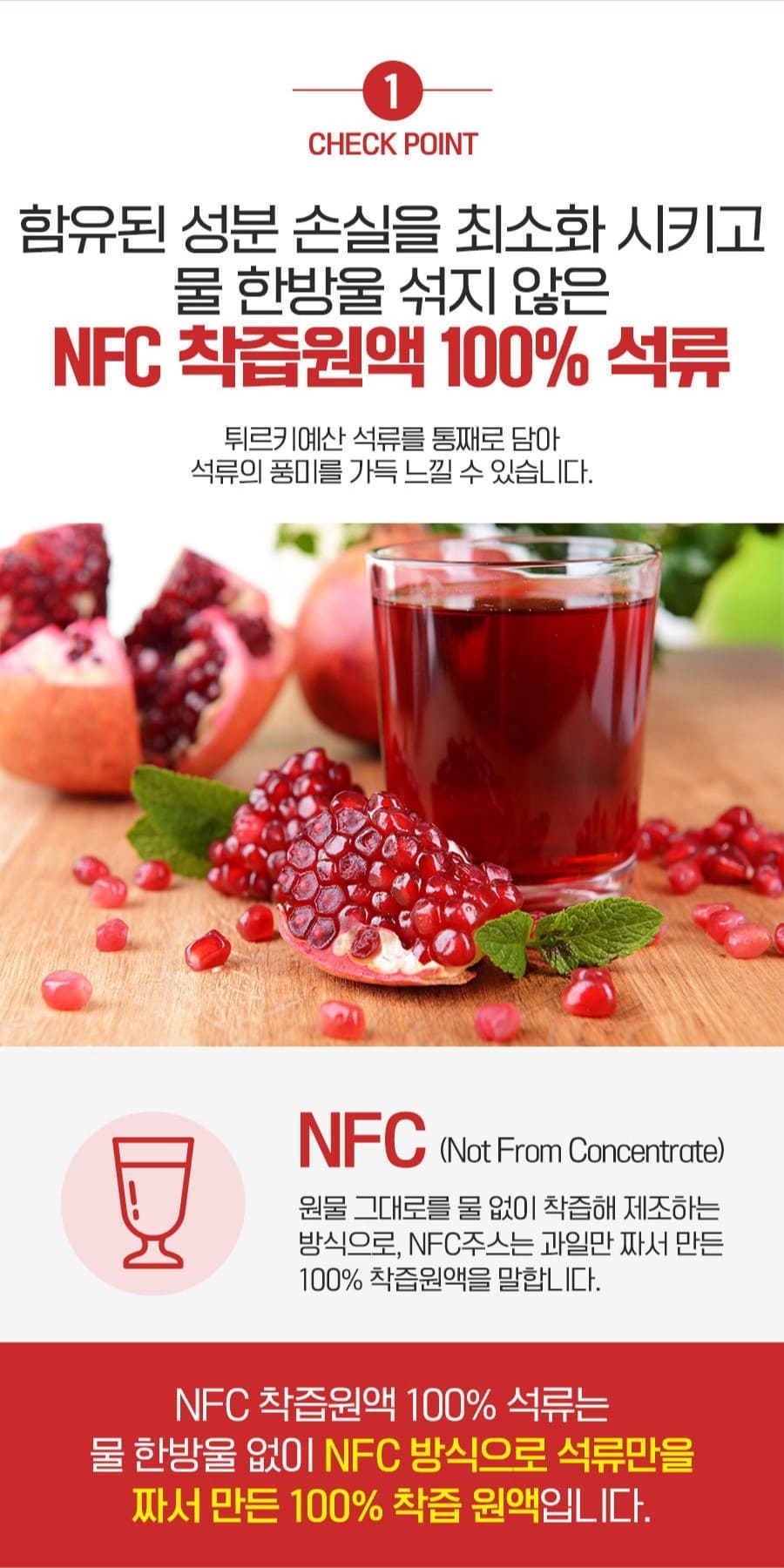 ¼®·ùÂøÁó¾×(Æ¢¸£Å°¿¹»ê) 100%, NFC(Not From Concentrate) ºñ³óÃà°úÁó. |